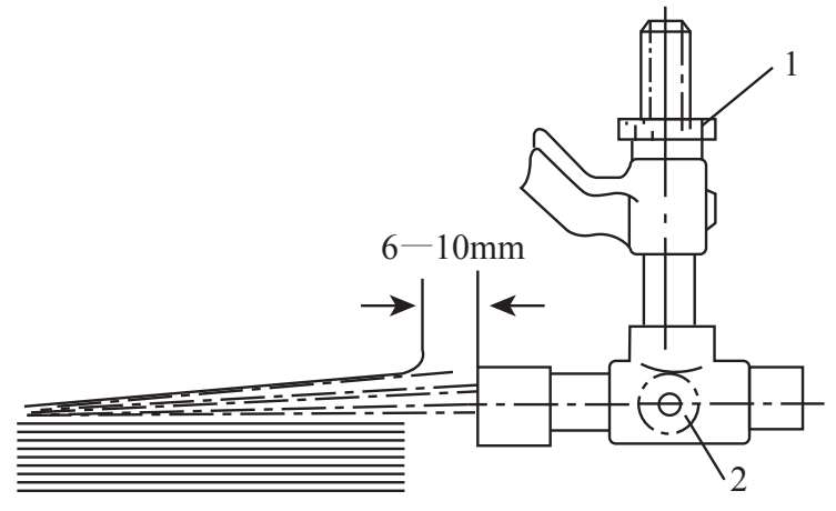 松纸吹嘴主要是将纸堆上方的纸张吹松,便于压纸脚下摆时压住纸张,协同分纸吹嘴将最上面的纸张分离。松纸吹嘴一般要求能将纸堆表层5~10张纸吹松为宜。松纸吹嘴的形状一般有矩形和圆形两种,印薄纸选用矩形,印厚纸或纸板选用圆形,因为圆形的出风口更集中,有利于吹松厚纸,风量大小可以通过调节阀来控制。为适应不同纸张的要求,松纸吹嘴的高低和前后位置可根据不同要求进行调节,一般距纸堆后边缘6~10mm。风量大小通过风量调节阀来控制,一般控制在纸堆最上面的2~3张纸刚好能和毛刷相接触为宜。松纸吹嘴工作示意图如图1-8所示。