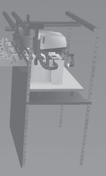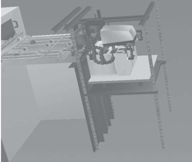 移动触控笔,主键单击左侧选择区的【结构拆装】按钮,操作模块区显示模切压痕设备的结构组成部分。将移动触控笔对应光标放置到输纸装置中的某一个零部件时,零部件上方显示该零件的名称,主键单击工具栏下的隐藏工具按钮,移动感应触控笔将模型区处给纸装置外的其他零件隐藏掉,可得模切压痕设备输纸装置如图1-17所示。