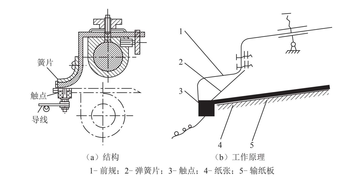 检测和控制装置主要用于检测输纸部件工作是否正常,如是否出现空张、双张、早到、晚到等输纸故障。常用的检测装置有双张检测装置、空张检测器、侧规装置、前规装置等。空张检测器主要用于检测纸张在输送过程中是否有空张、残页、折角、早到、晚到等现象。常见的空张检测器有电触片式空张检测器、光电片式空张检测器、光栅片式空张检测器。电触片式空张检测器结构示意图如图1-15所示。