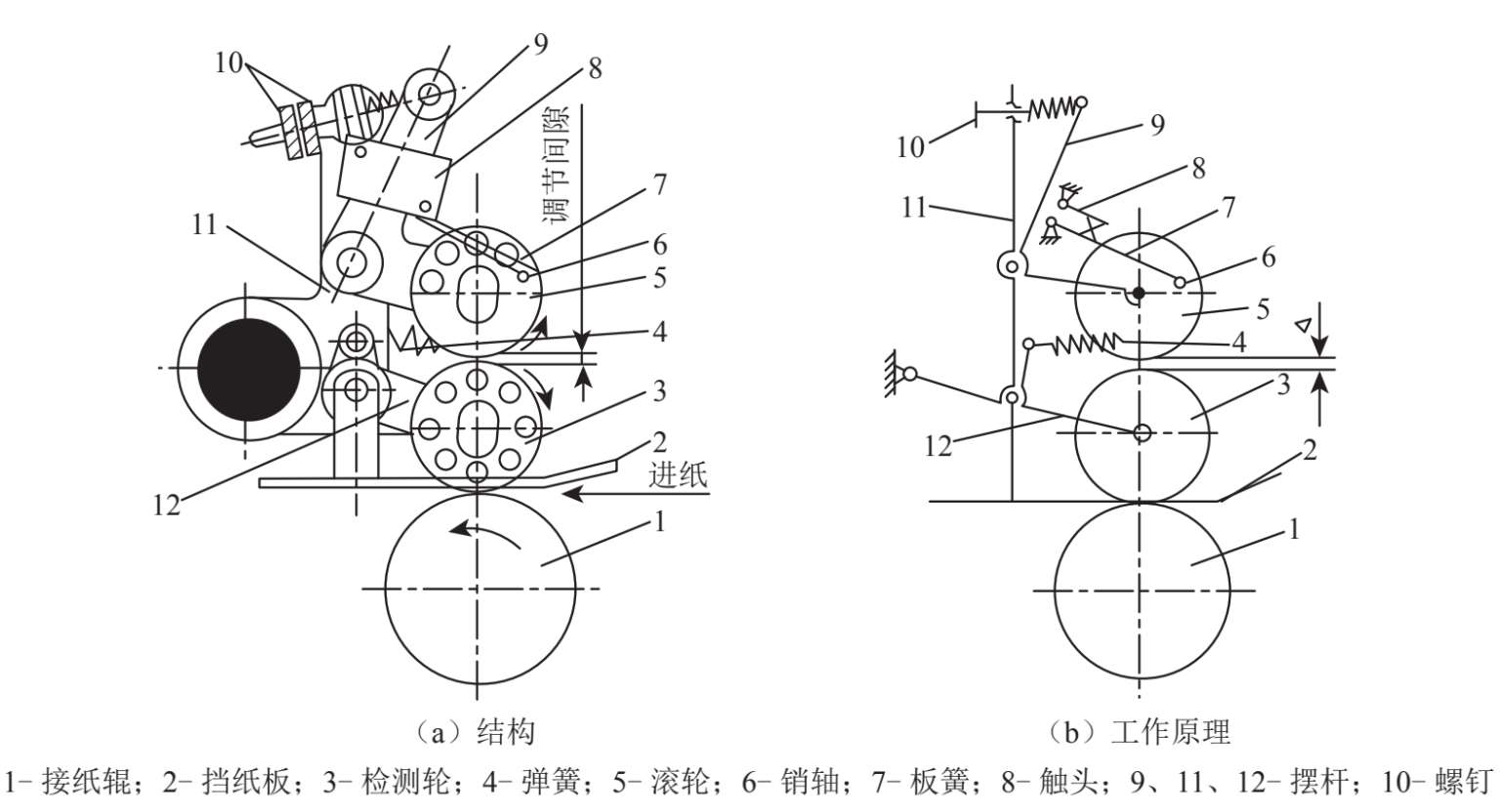 双张检测器主要用于检测纸张在输送过程中是否同时出现双张或者多张现象,常见的双张检测器有机械式双张控制器、光电式双张控制装置器、固定式双张控制器、双轮式双张控制器。双轮式双张控制器结构示意图如图1-16所示。