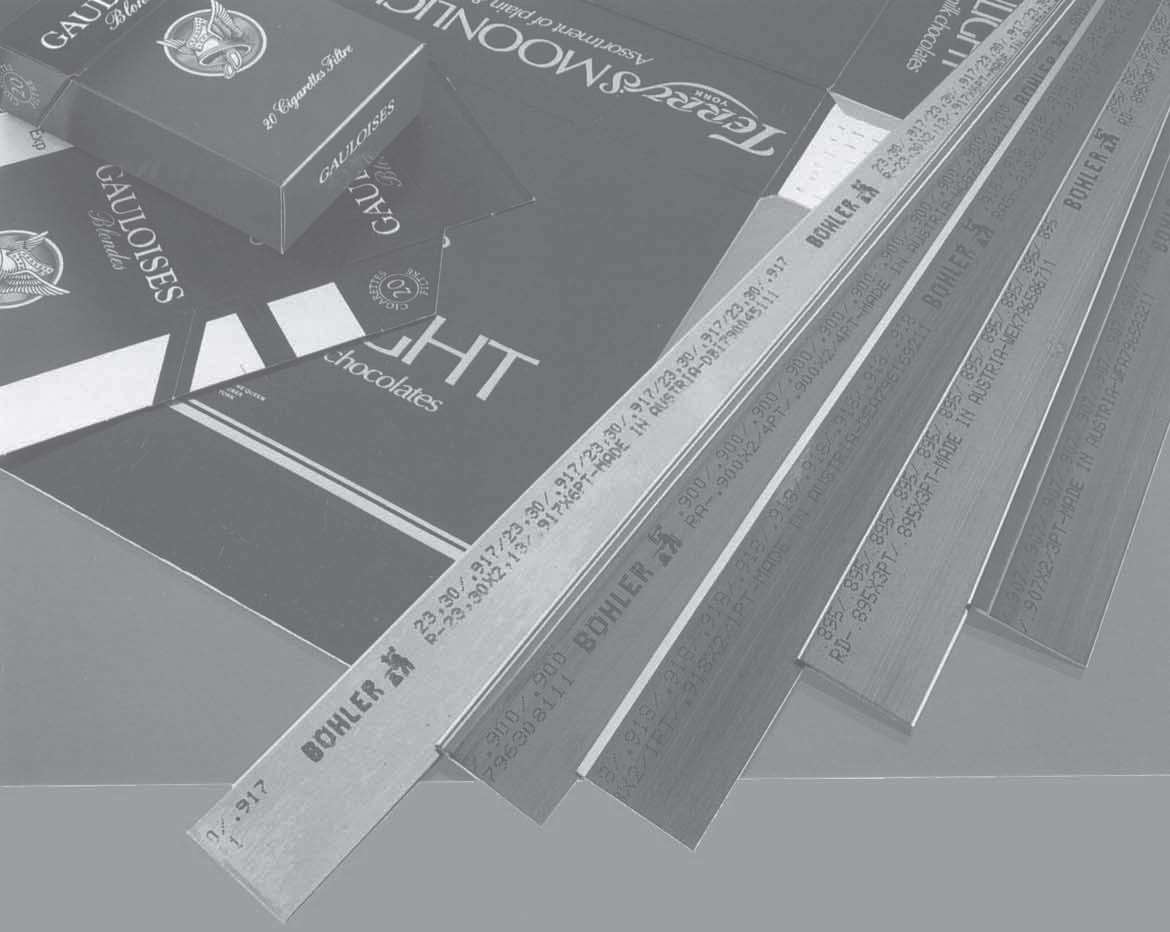 模切刀具也称钢刀(见图1-19),刀口锋利,能将纸板切断,得到所要求的纸盒胚料形状。通常要求钢刀应具有锋利、耐磨损、弯曲方便等特性。根据不同模切材料的要求,钢刀材料分为硬性、中硬性和软性三种,可根据需要灵活选用。由于被模切产品形状各异,需要将钢刀弯成各种各样的形状,硬性钢刀弯曲性能较差,中硬性钢刀弯曲性能较好,软性钢刀弯曲性能最好,操作者可依据实际要求进行选择。