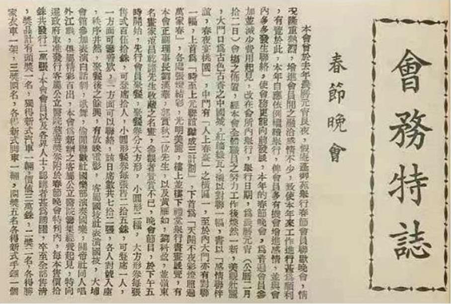 《泰国华侨客属总会报告书》出版,其中“会务特志”一栏中记载一则举行春节晚会的消息,其中记有偷间联欢社国乐部演奏国乐,关帝社同人唱外江戏。