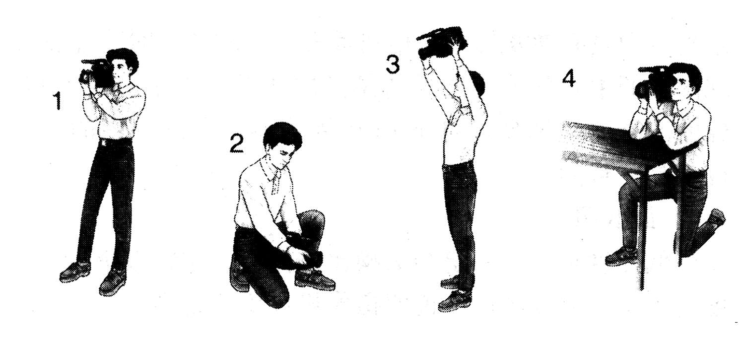 操作摄像时,首先要掌握正确的执机方法,不正确的执机姿势会影响摄像机功能的发挥,影响摄像效果。一般情况应尽量使用支撑装置,如三脚架等。没有条件时,通常使用站姿、全蹲姿、举姿、跪姿几种相对稳定的姿势进行拍摄,如图2-7所示。肩扛执机式是最基本的操作方法,具体做法是:右肩扛住摄像机,右手握住手柄,操纵电动变焦键和记录启停键。左手配合右手进行其他操作,如扶住或转动寻像器进行手动聚焦、手动变焦、日期显示等。拍摄时还要尽量利用身边的依靠物,如树木、扶梯、墙壁等,使摄像机保持相对稳定。边走边拍时,为减轻因走路而产生的垂直震动,双膝应略弯曲,脚与地面平行擦地移动,并放慢和减小步幅。