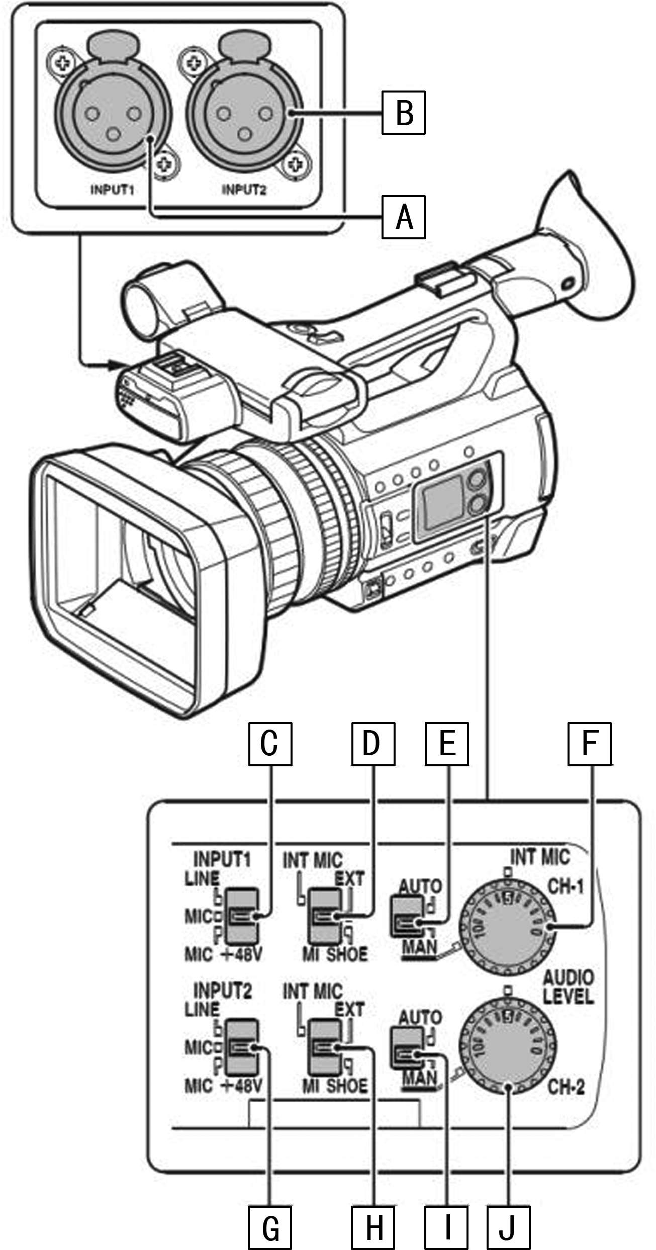 提示:当使用含两个XLR插头的立体声麦克风时,将左声道(L)连接到INPUT 1插孔A,将右声道(R)连接到INPUT 2插孔B,然后将CH-1(INT MIC/EXT/MI SHOE)开关D和CH-2(INT MIC/EXT/MI SHOE)开关H设定为“EXT”。