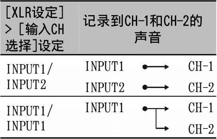 ·如果在[XLR设定]菜单中将[输入CH选择]设定为[INPUT 1/INPUT 1],INPUT 1插孔上的音频输入会记录到CH-1和CH-2。