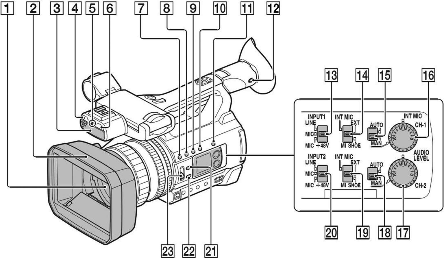 可以使用如下所示的插孔、开关和拨盘来设定录制的声音。