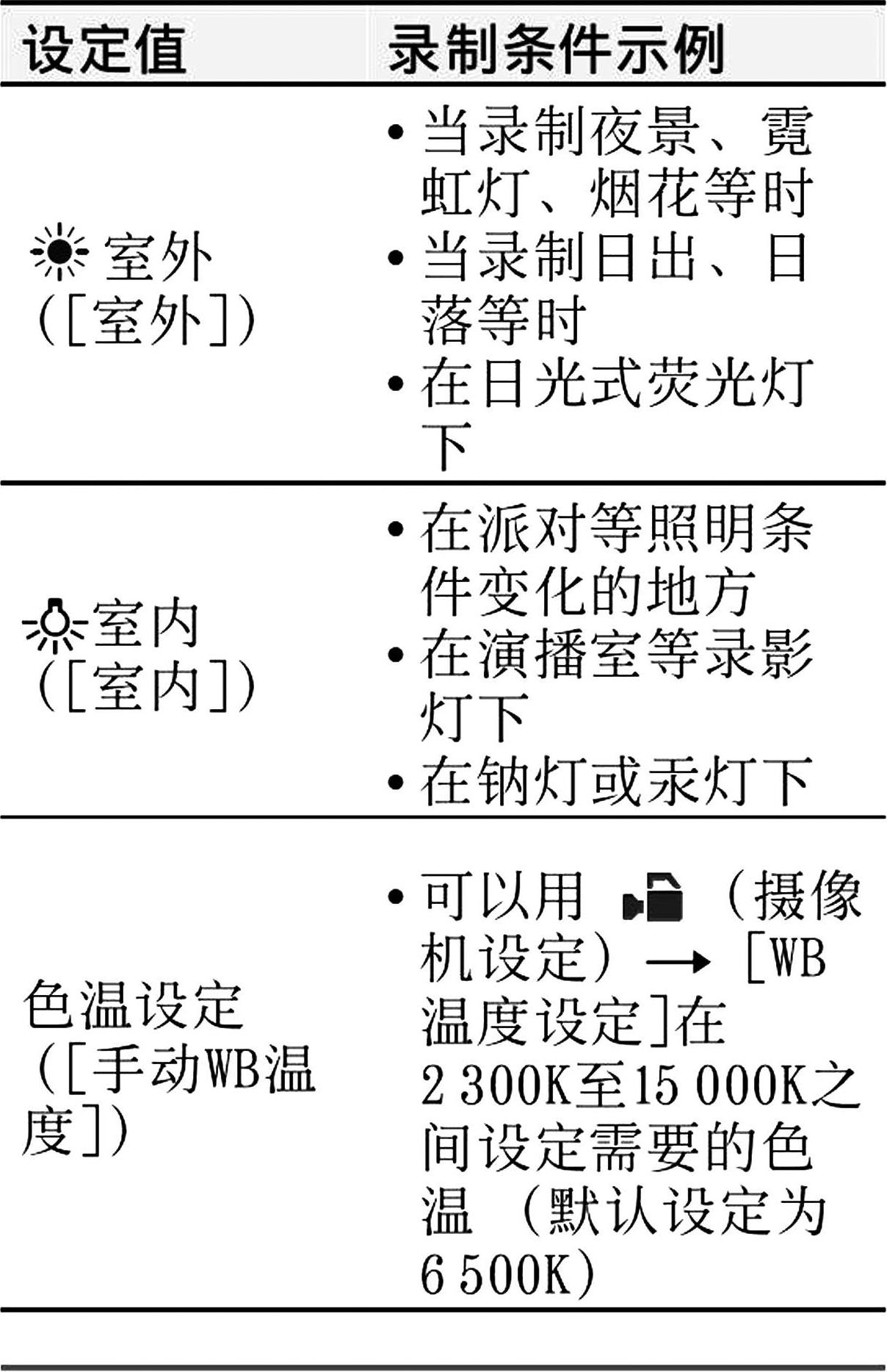 (摄像机设定)菜单中的[WB预设]所作的设定来选择[室外][室内]或[手动WB温度]。