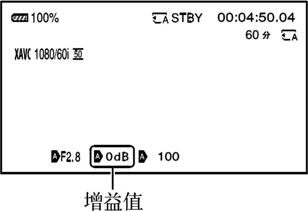 使用手动调节杆D调节数值。设定值:33 dB、30 dB、27 dB、24 dB、21 dB、18 dB、15 dB、12 dB、9 dB、6 dB、3 dB、0 dB(默认值)、-3 dB。