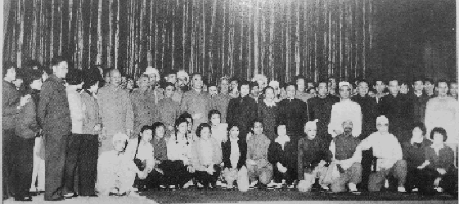 图47 1963年12月,周恩来总理与广东省委书记陶铸等党政领导人在广州观看大型粤北采茶戏《血榜恨》后,与全体演员合影
