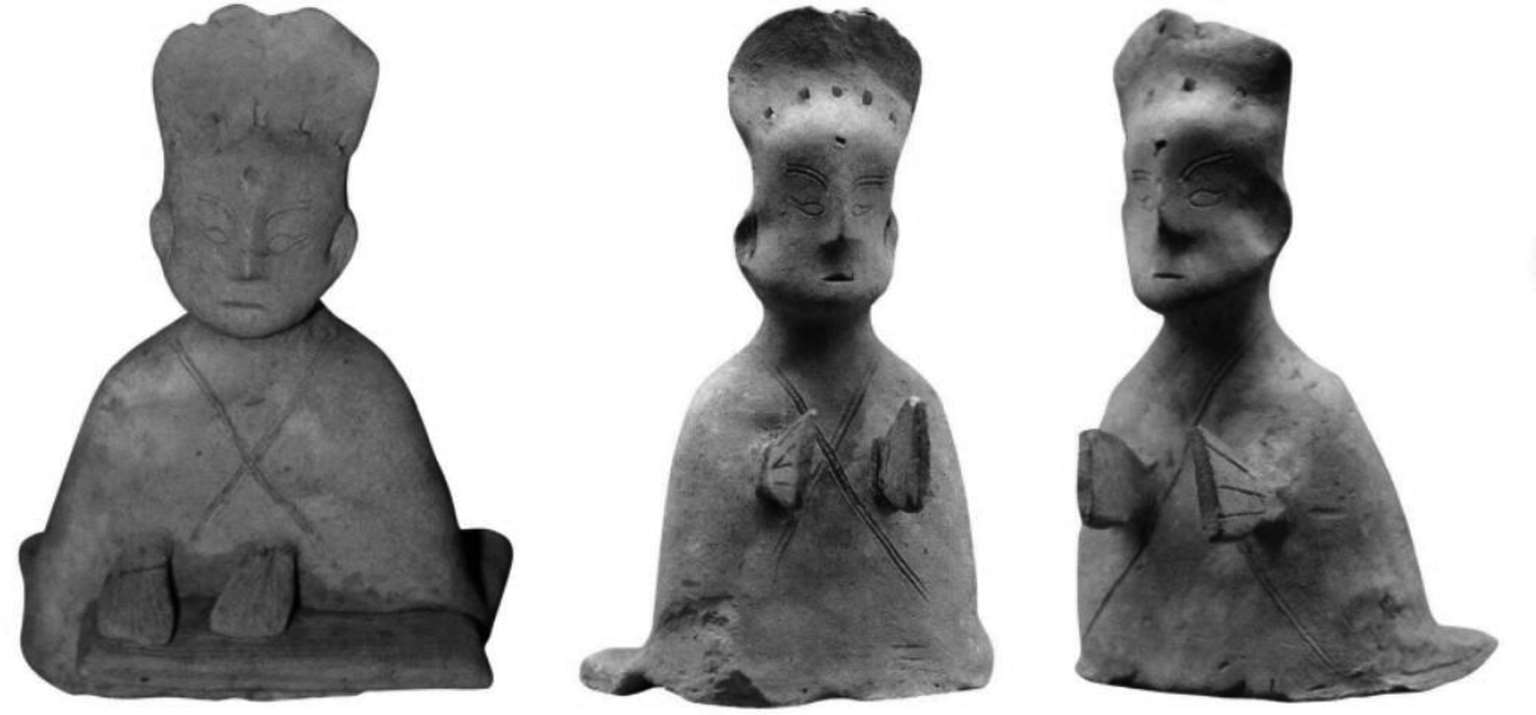 图7 1955 年在广州东郊麻鹰岗出土的东汉“陶乐俑”三尊(左为抚琴俑,中、右为击掌俑)