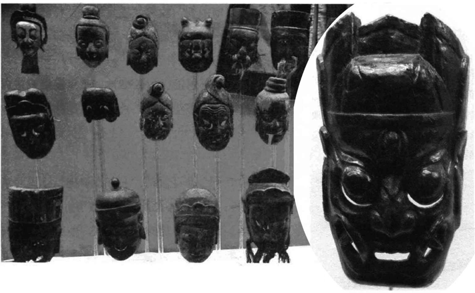 图11 清代粤北师公戏表演面具(左为正面人物面具,右为妖魔面具)