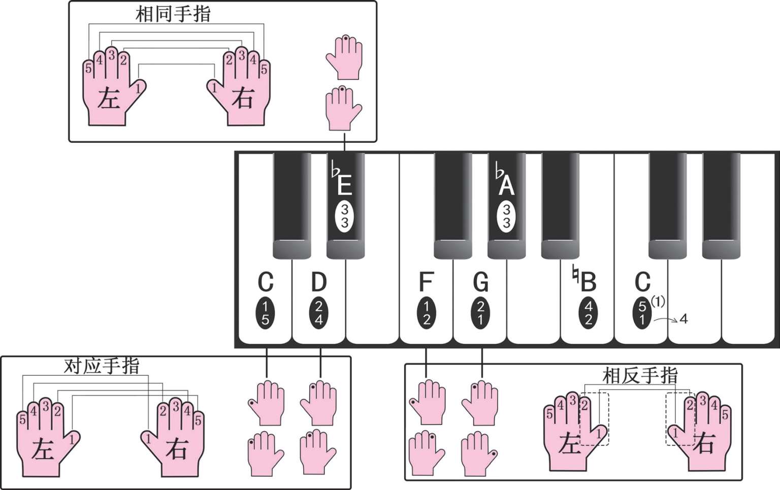 ③ 相反手指:指左右手两根手指同时弹奏两个音时,左右手正好相反的一对指序