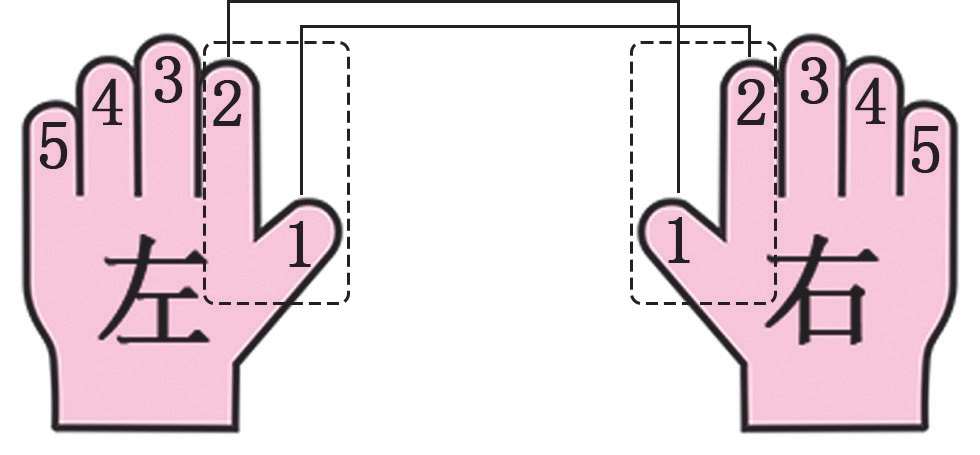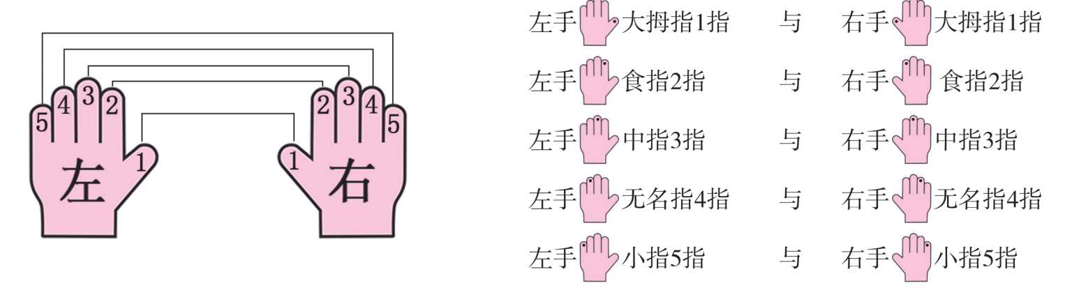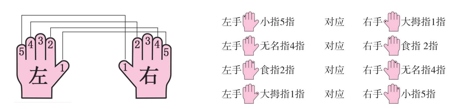 ② 相对应手指:指同一方向,两手平移后完全重叠在一起时,对应的手指名称