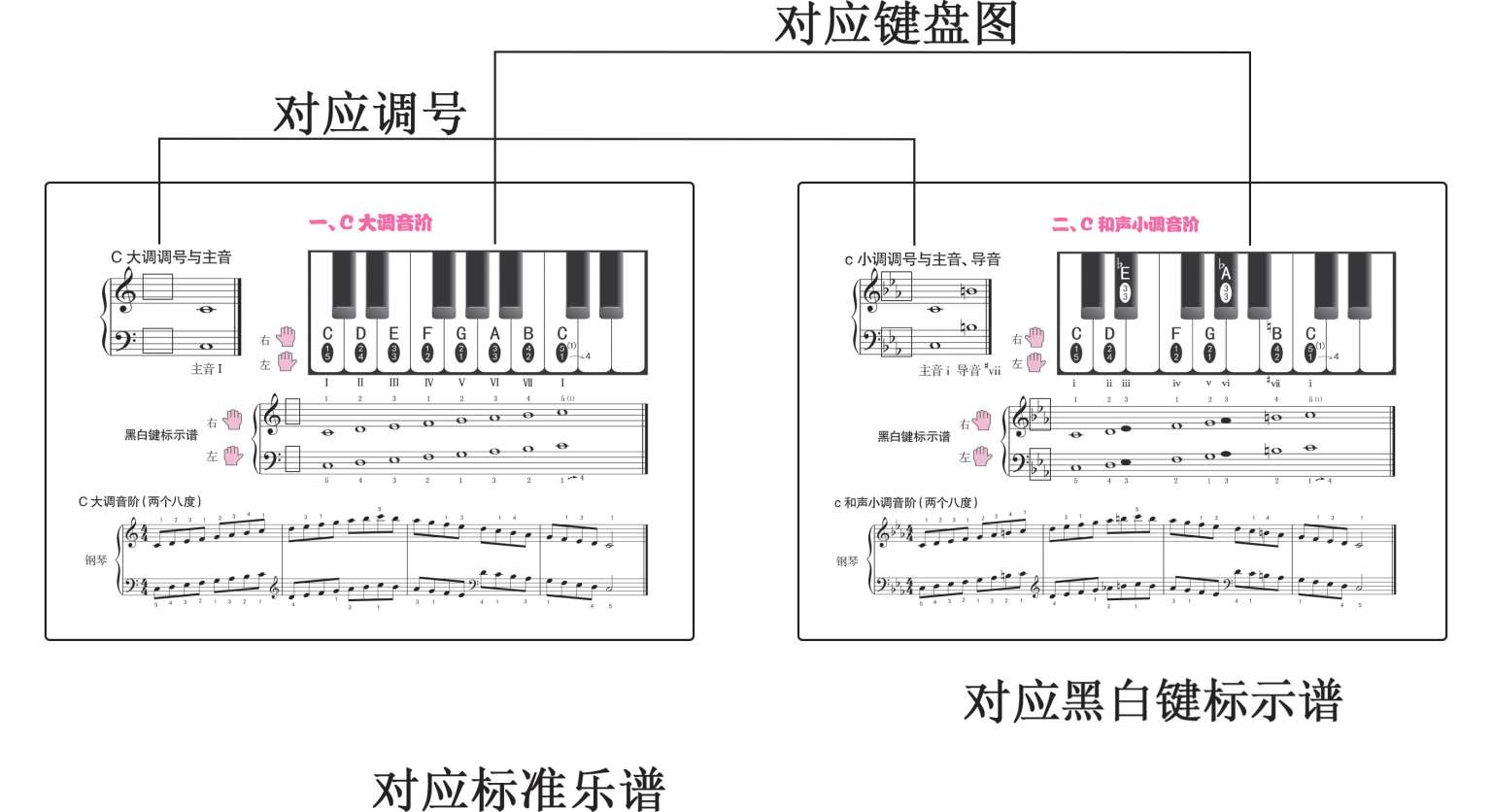 方便同主音大小调的对应学习与对比分析。同主音大小调具有主音相同、指法相同(个别黑键调除外)、音序与音名相同(III、VI级变化除外)的特点。