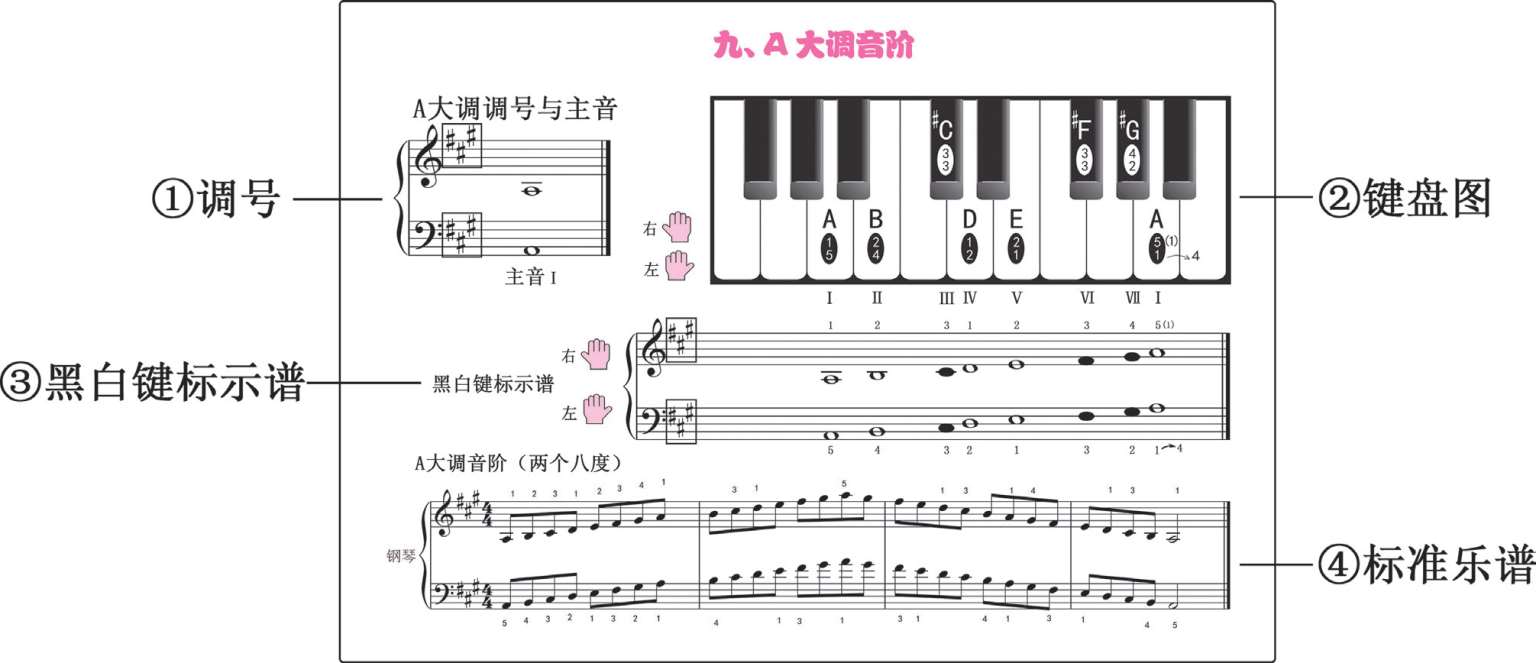根据白键与黑键的指法规律进行编排。打破传统调号数量由少到多的分类模式,直接由钢琴的键盘弹奏规律入手。