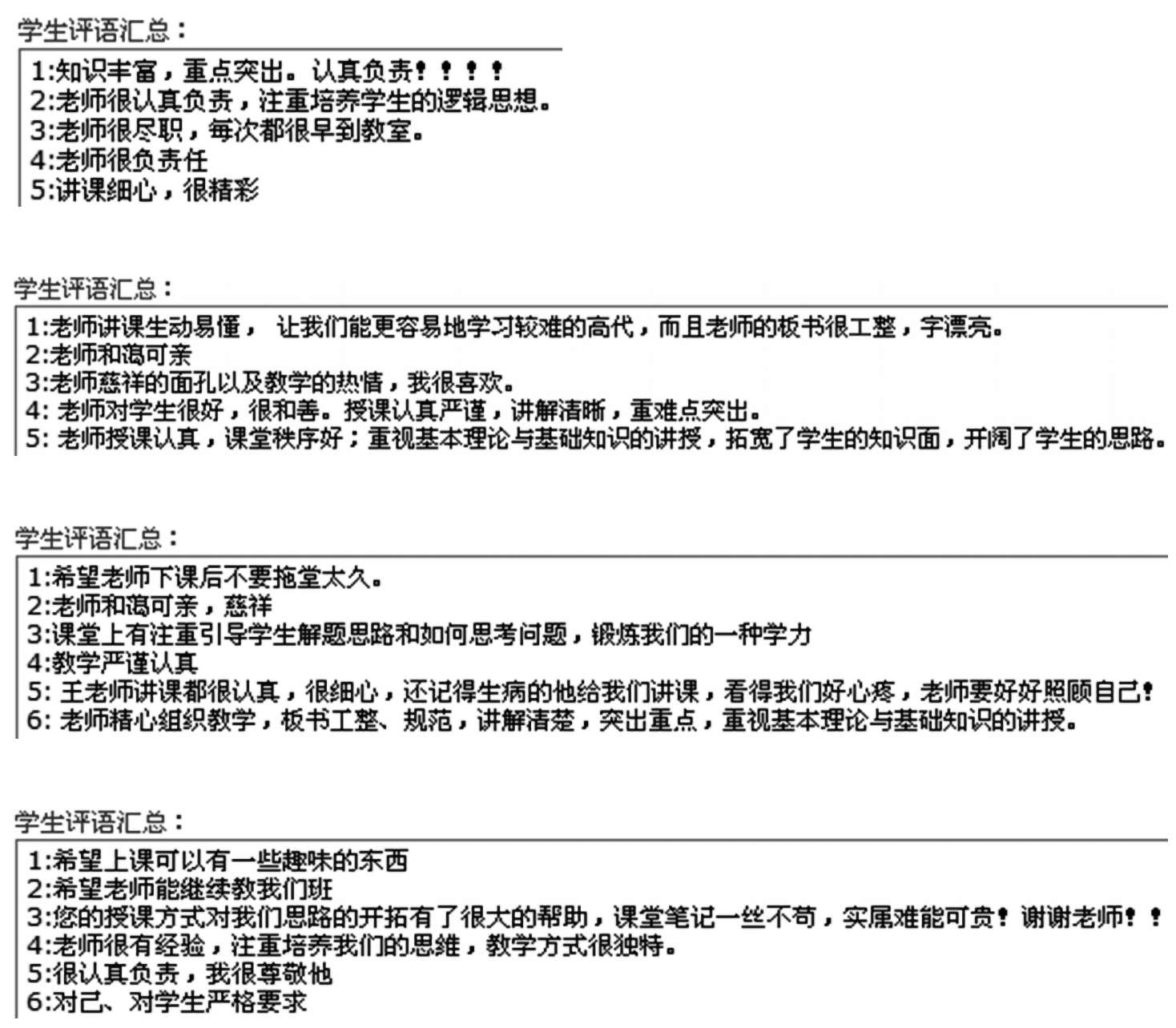 行动研究主要是在实际教学中,边实践、边思考、边改进,以至不断完善研究成果。几年来,笔者结合自己所教的主要课程——高等代数、近世代数、数学实验等进行了实践研究,实践证明“过程→生成”教学行之有效,且受学生欢迎。图2.5是2008-2011年学生对笔者教学的评语(来自本校教务系统中的学生评价栏目):