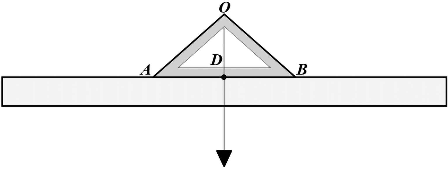 讲授 B : 同学们,我们知道,房梁的安装需要水平,然而,木工师傅却因走得匆忙而忘记带水平尺了。怎么办?去买?去借?还是回去拿?都不现实。“别急”,一声吆喝,木工师傅不慌不忙地动起手来:先做一个有两边相等的三角形木架(记为△ OAB , OA = OB ),找出 AB 的中点 D 且做标记,在 AB 的对角的顶点 O 处钉一个钉子,钉子上系一条拴有重物的细线,在安装房梁时,将△ OAB 放在房梁上,使 AB 与房梁重合,然后调整房梁两端的高低,当细线经过 D 点时(参见图2.3),师傅就说,好了。
