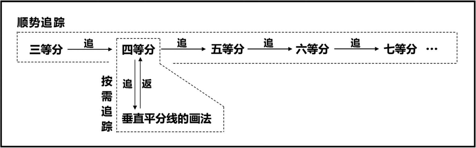 这个自学过程包含两种“追踪”学习方式(见图2.2):一种是 顺势追踪 ,三等分→四等分→五等分→六等分→……都是自然的思考:有三必有四,有四必有五……顺势而下,纵向深入,探究未知,亦可谓 纵向追踪 。另一种是 按需追踪 ,如追到四等分圆周时,需要作垂直平分线,那么就去追寻垂直平分线的作法,然后再返回到四等分,这是节外生枝,所以亦可谓 横向追踪 。一般地说按需追踪发生在顺势追踪的某个节点上,也就是说认识这个节点,还需要别的知识相助,所以就需要“分叉”追出去,追踪完成后,即要返回去。