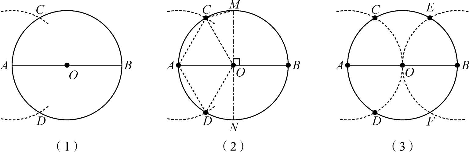②根据“等分圆周只要等分顶点在圆心的周角即可”的经验,由图2.1(1)想到了图2.1(2)。而图2.1(2)中∠ AOD =∠ AOC =60°,∠ DON =∠ COM =30°,且这四个角的和是180°,所以四边形 OCAD 关于 MN 对称(在小学学过简单的对称知识),于是即想到图2.1(3)。
