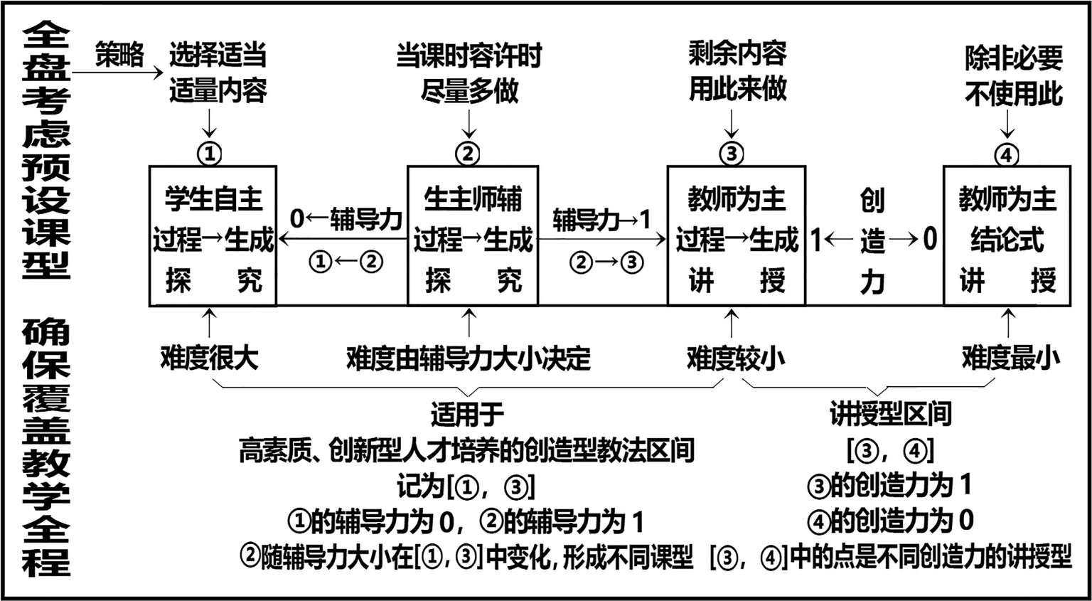 根据上面讨论,我们将教学方式归纳为四类(见图1),其中,①、②、③都能适应新型目标,从能量大小或难度大小来看都应是① > ② > ③。在具体实践中,可根据内容(重要性、可能性)与课时全盘考虑,有目的、有计划地预设授课课型,预设的基本原则是既要争取做到最好,又要保证课时够用。具体说也就是,在确保课时够用的前提下,根据内容的易难度,适量选用课型①,尽量使用课型②,余者使用课型③。如此做,教学全程必充满创造性能量。