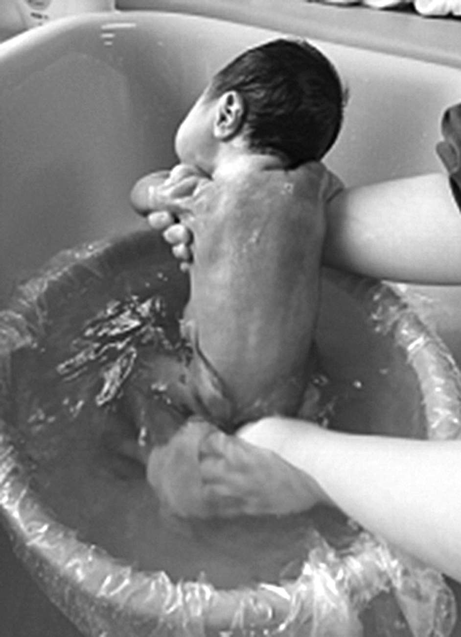 (3)洗干净后小心地将新生儿抱出,放在平铺的清洁干燥大浴巾上,吸干其全身水分,尤其是耳后、关节和身体褶皱处。
