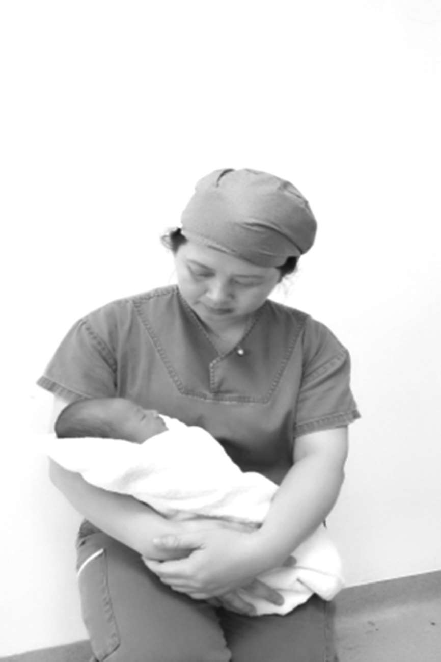 这个时候,配合腰部和手部力量就可以慢慢地把新生儿的头支撑起来了,注意一定要托住新生儿的颈部,否则其头会往后仰。可分站立抱法、坐下抱法两种,如图2-4、图2-5所示。