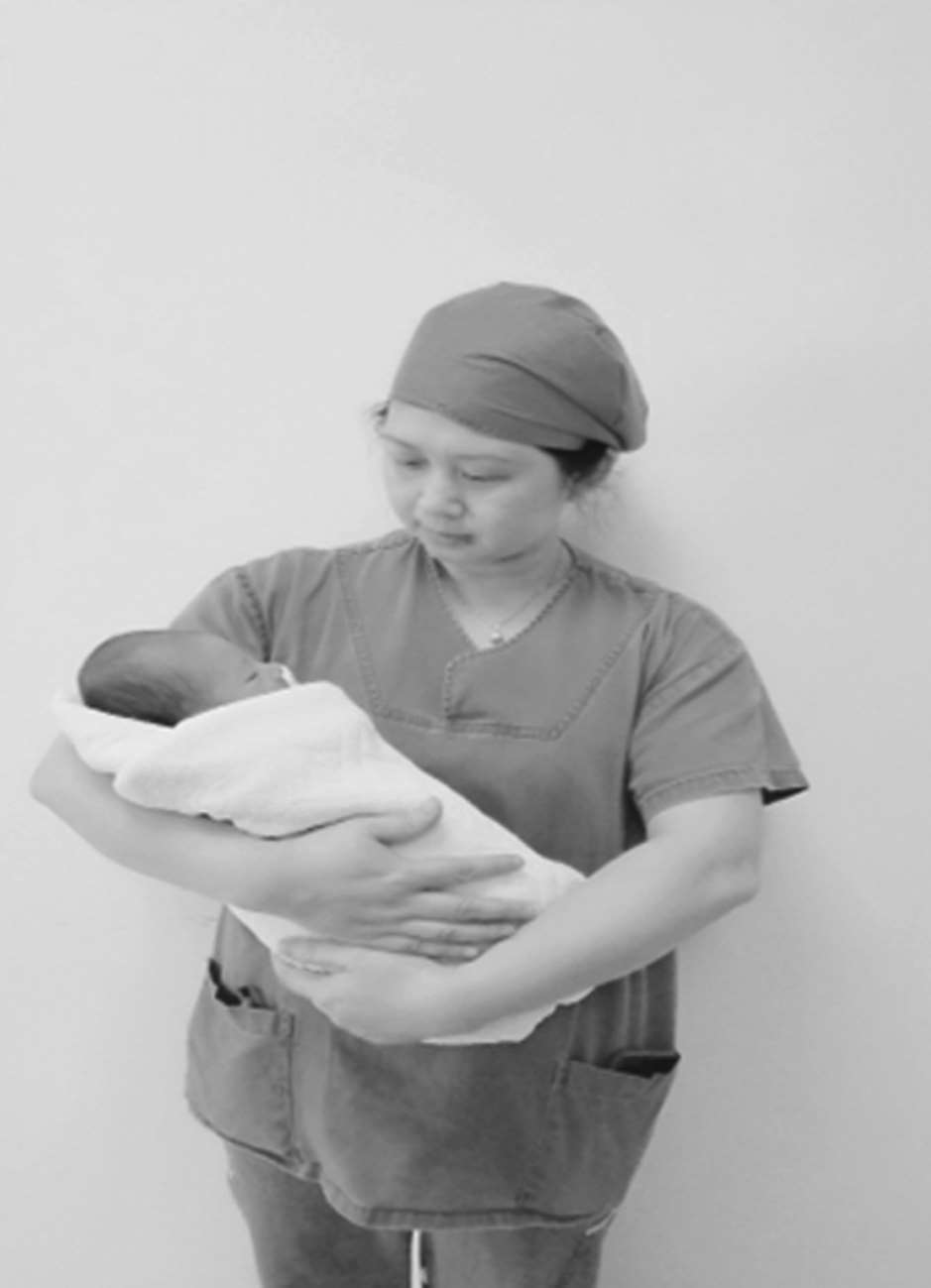 (2)腕抱法。将新生儿的头放在左臂弯里,肘部护着新生儿的头,左腕和左手护其背和腰部,右小臂从新生儿身上环绕护着新生儿的腿部,右手托着新生儿的臀部和腰部。这是常用的一种托抱姿势。