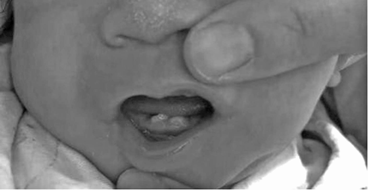 “马牙”或称“板牙”(见图1-1),是指在新生儿上颚中线和齿龈部位有黄白色的小点,是上皮细胞堆积或黏液腺分泌所致,数周或数月后可自行消失,但也要防止因自然脱落而引起窒息。