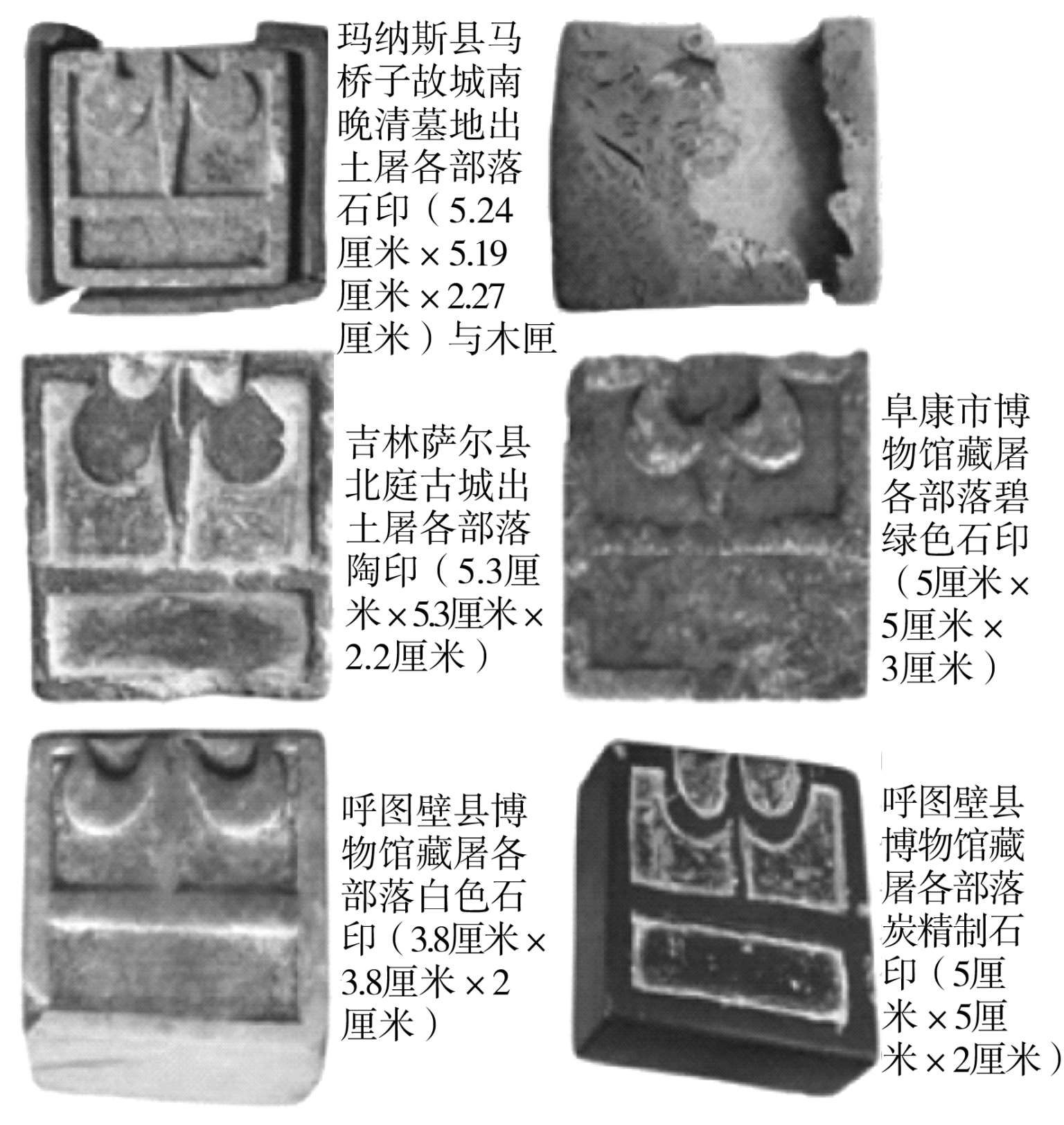 ”形图案还见于沙雅县博物馆藏塔什墩村出土的刻石(见图11)、木垒县菜子沟古墓所出石印之印匣正面及玛纳斯马桥子故城南晚清墓地所出石印之印匣背面,而图案相同的石印、陶印在吉木萨尔县、阜康市及呼图壁县也均有发现(见图12)。特克斯县铁里氏盖的链状墓中还曾出土4件红铜铸制的月牙形铜饰。中天山北麓地区是乌古斯部族的崛起之地,“〇”形、“