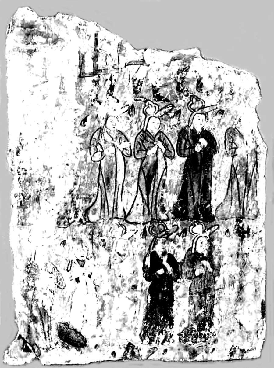 图15 吐鲁番哈萨尔城附近出土壁画中的回鹘女供养人群像(吐鲁番地区文物中心编:《高昌壁画辑佚》,新疆人民出版社,1995)