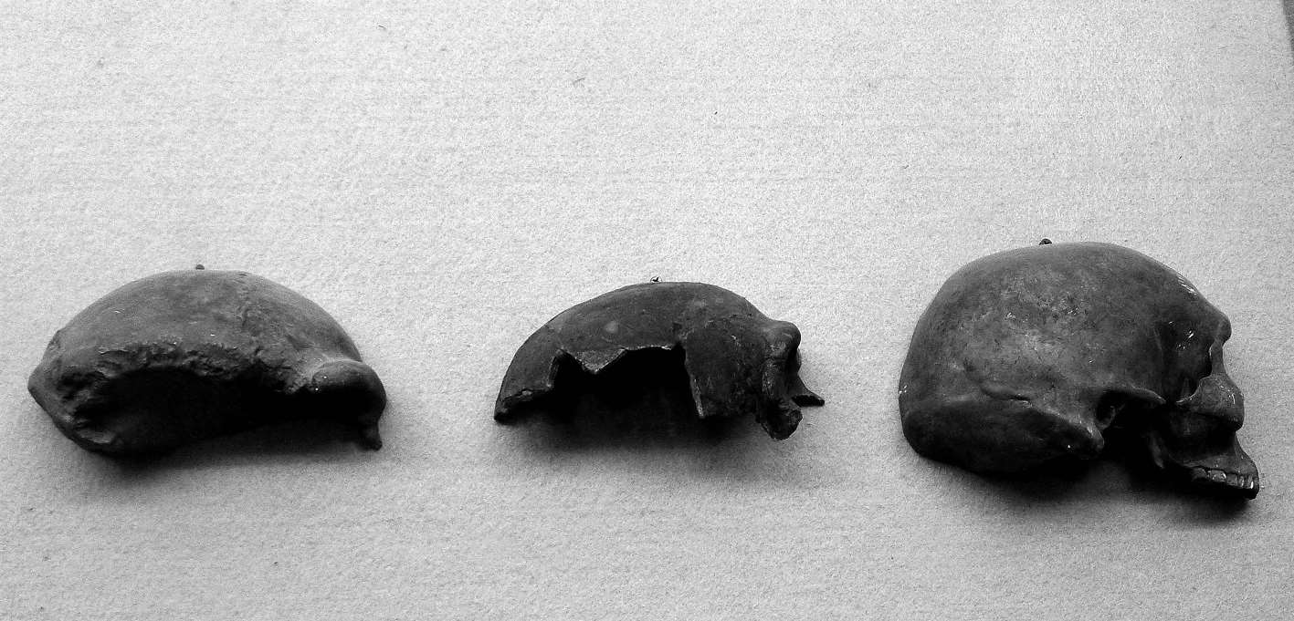图1-11 北京人、马坝人、山顶洞人头骨(从左至右)