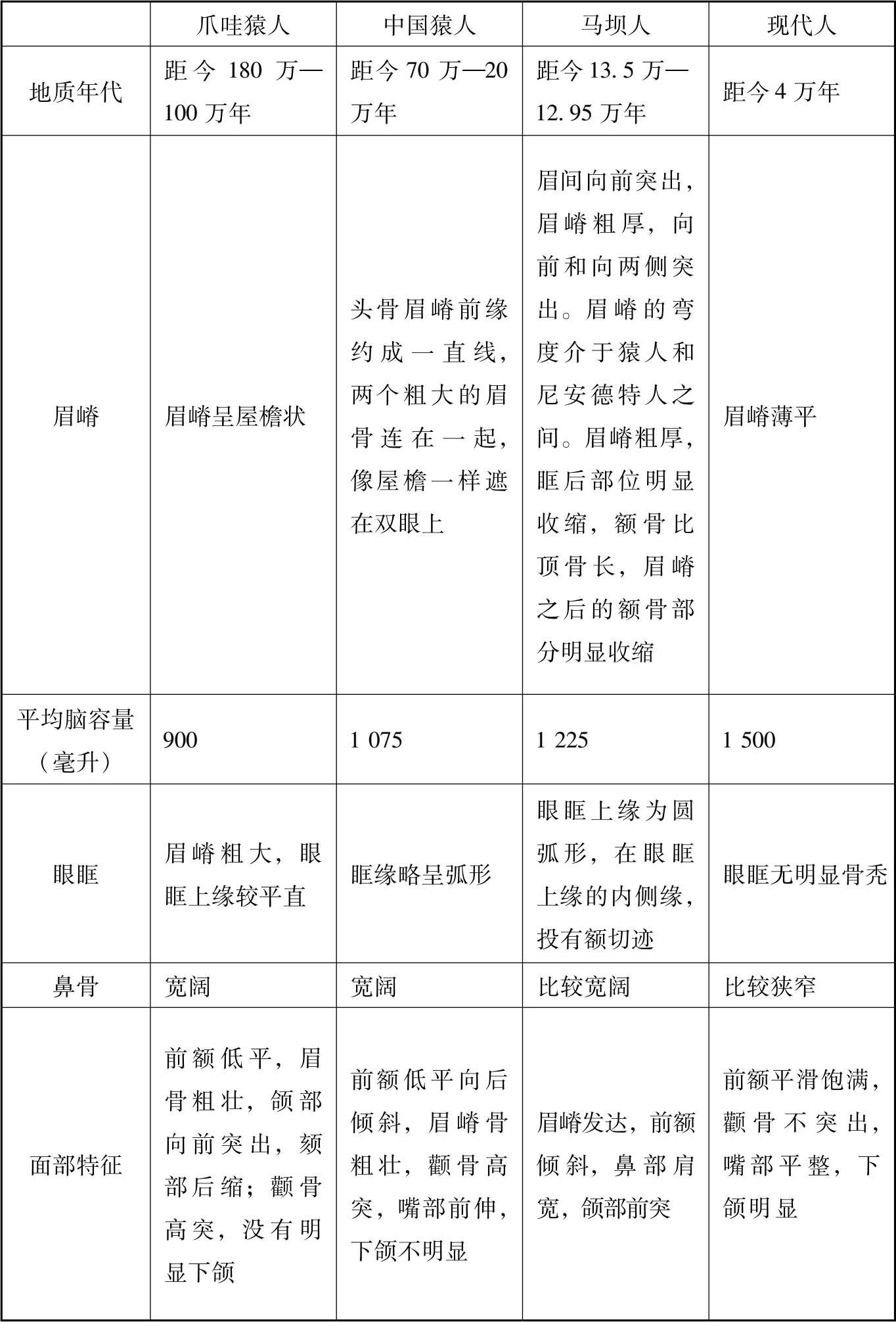 表1-2 马坝人与其他古人类头骨化石比较