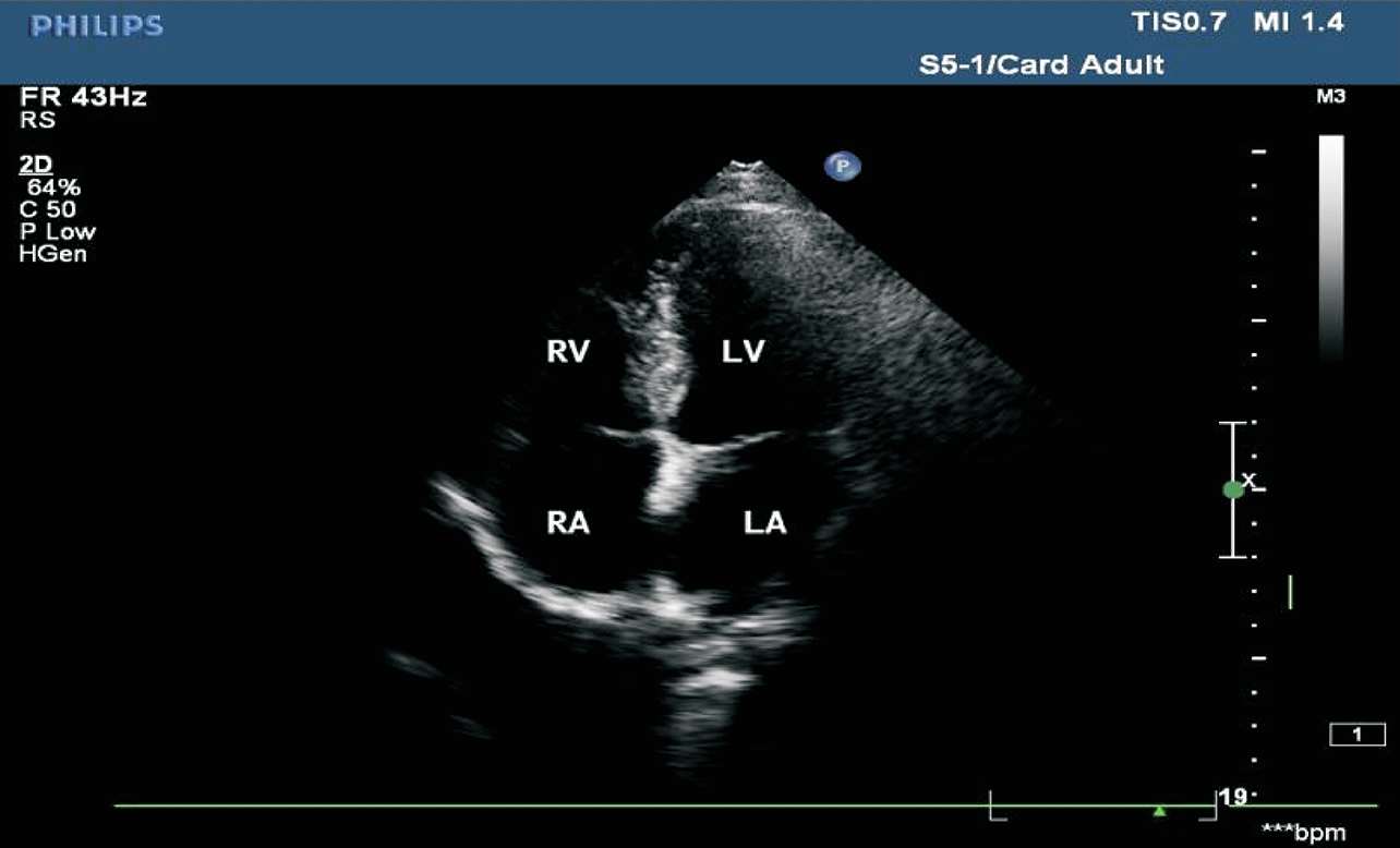 图1-32 心尖四腔心切面(RV:右心室;RA:右心房;LV:左心室;LA:左心房)