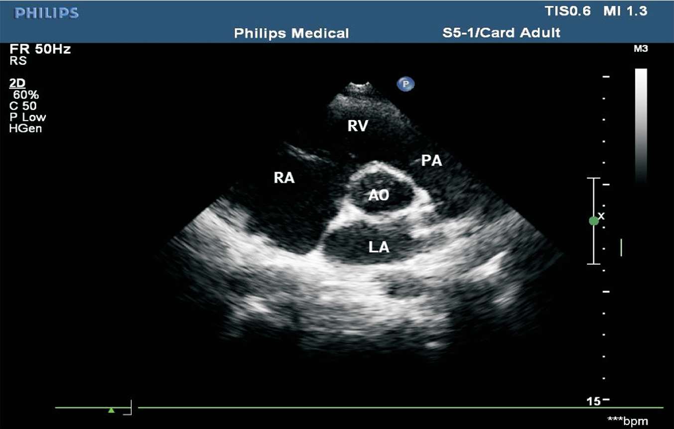 图1-27 心底大动脉短轴切面(RA:右心房;RV:右心室;PA:肺动脉;AO:主动脉;LA:左心房)