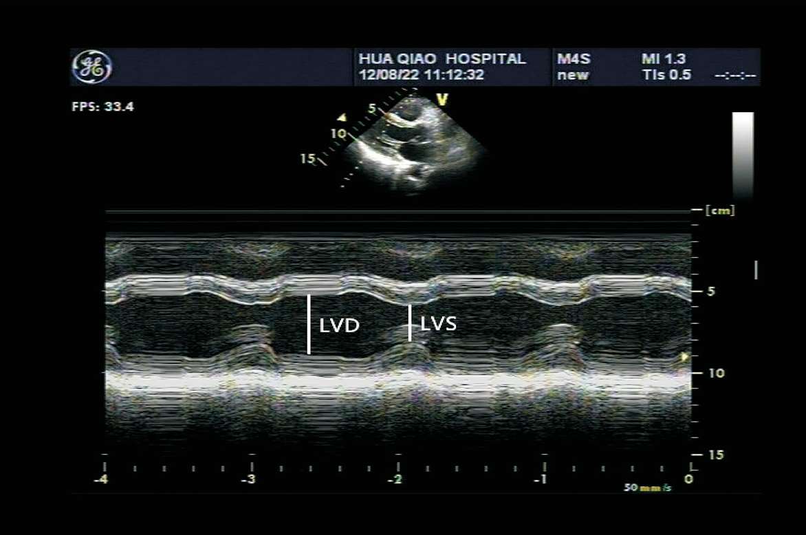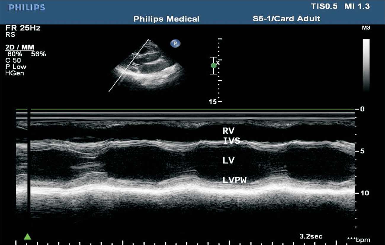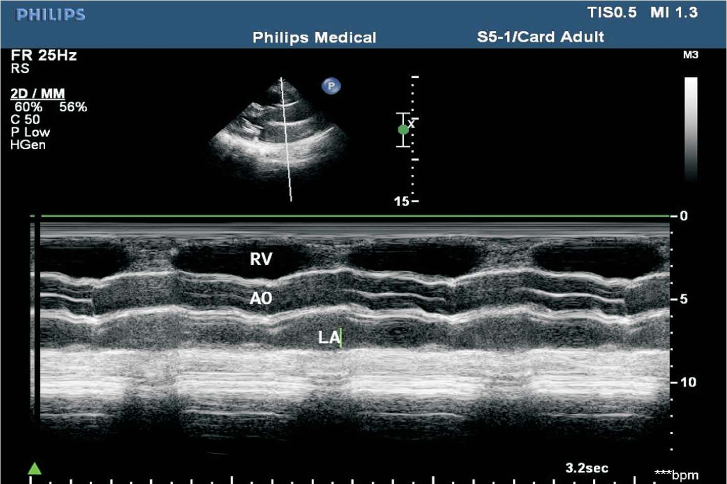 (1)胸骨旁左室长轴切面M型取样线置于二尖瓣腱索水平。
