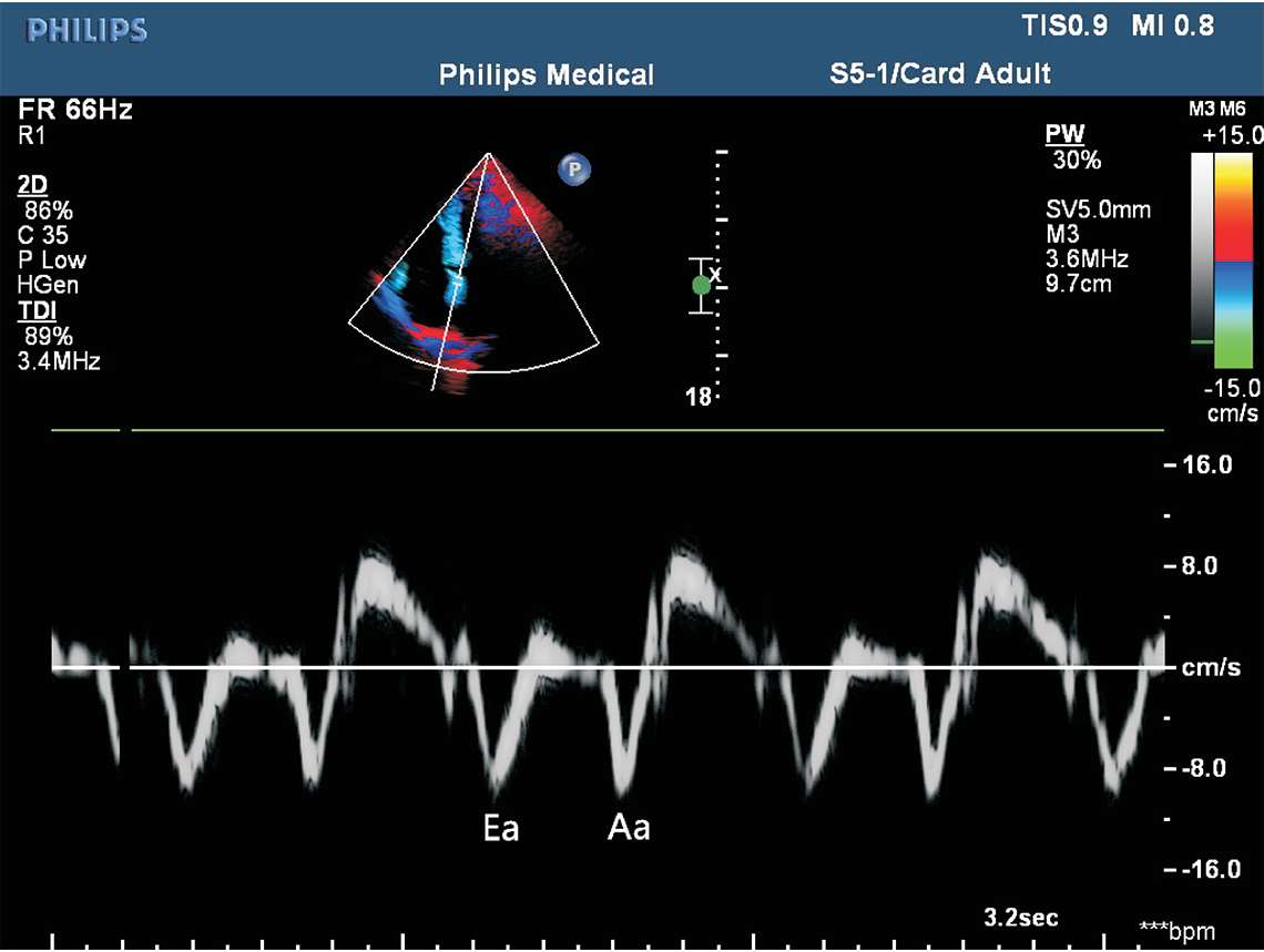 (2)组织多普勒频谱。二尖瓣环舒张期频谱主要是舒张早期Ea(E′)峰及舒张晚期Aa(A′)峰。正常状态下:Ea峰/Aa峰>1;Ea峰>8.5 cm/s;Aa峰>8 cm/s(见图1-37)。