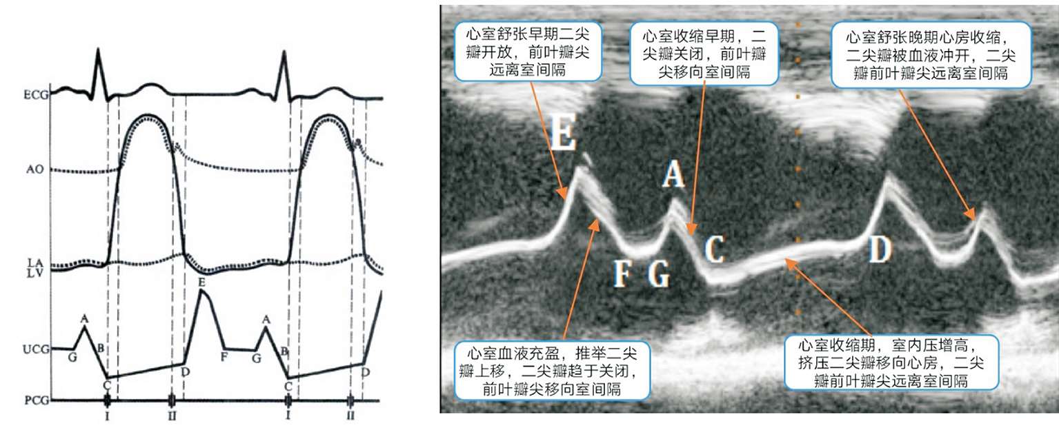 这种双峰曲线具有一定的特异性:A峰位于心电图P波之后,心房收缩推动二尖瓣前叶向前运动。C点位于心电图R波之后,此时心肌收缩,心室压力升高,二尖瓣关闭,产生第一心音。CD段为关闭的二尖瓣随左室后壁的逐渐前移而前移。D点出现于T波与第二心音之后,标准二尖瓣口即将开放。E峰为二尖瓣开放至最大时形成,随后由于左心房排空,左心室充盈,房室间压差迅速减小,二尖瓣前叶曲线迅速下降至F点(见图1-22)。