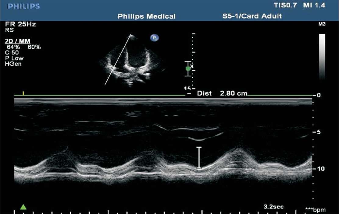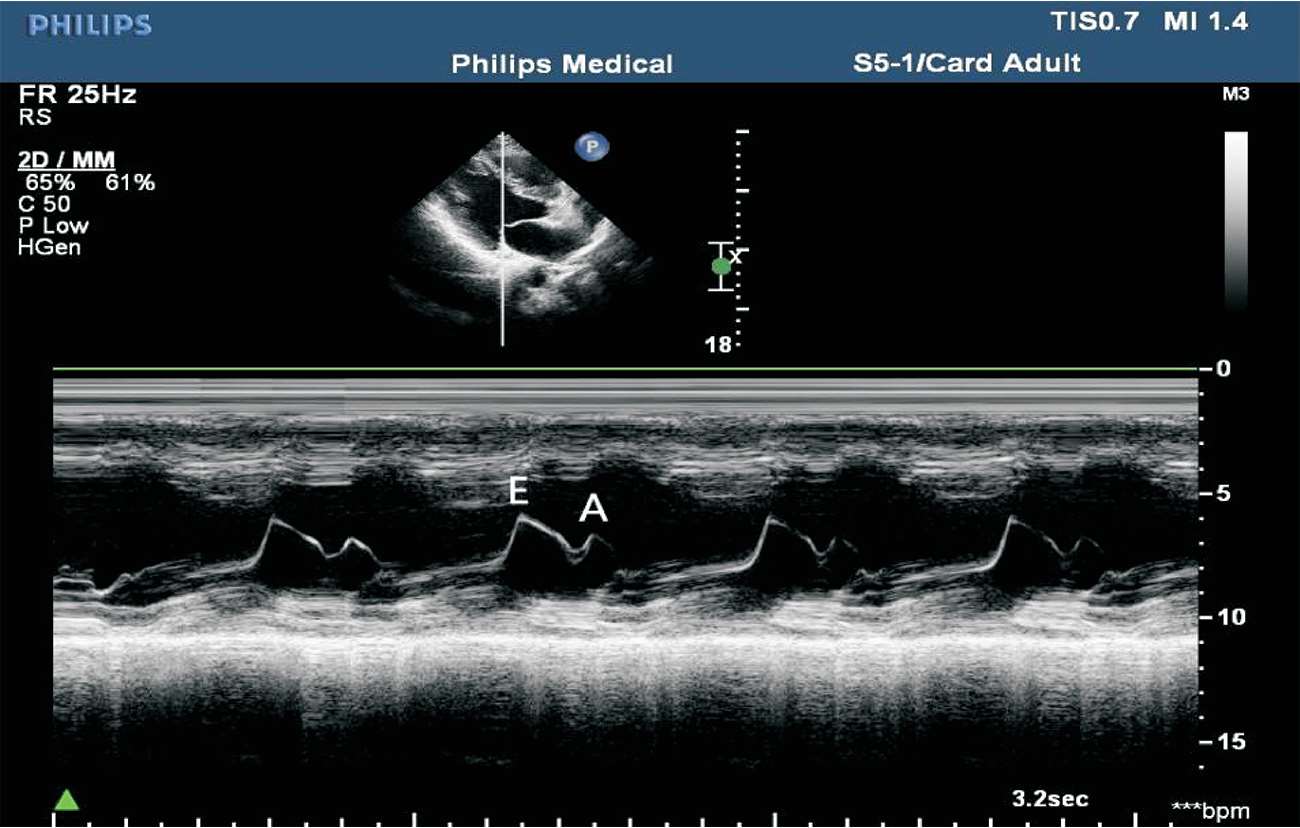 (1)胸骨旁左室长轴切面M型取样线置于二尖瓣瓣尖水平。