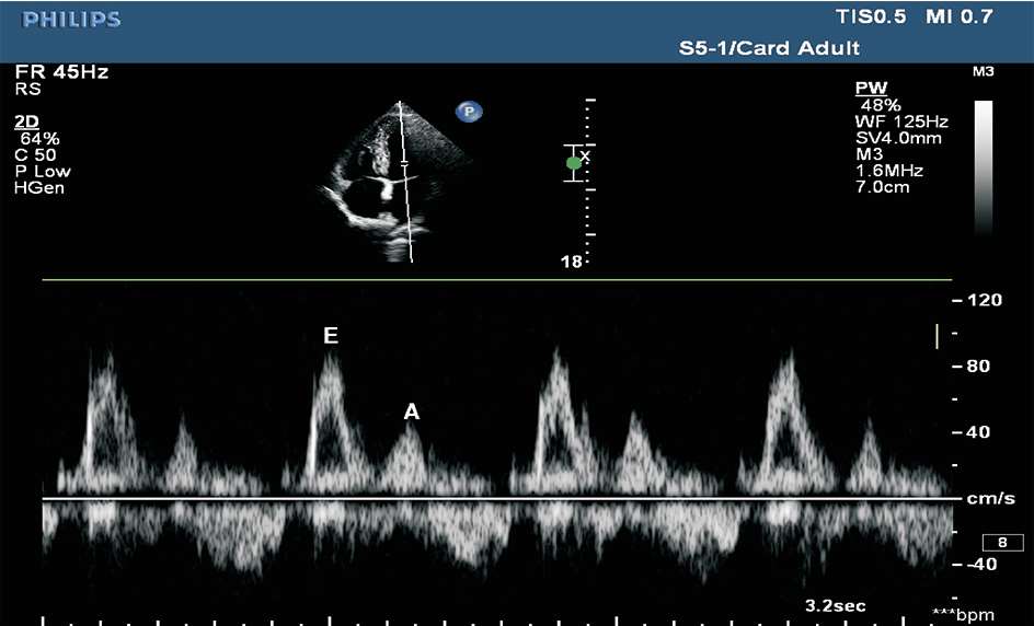 二尖瓣脉冲型频谱多普勒取样框置于二尖瓣瓣尖水平,取样线平行于血流。二尖瓣舒张期血流频谱包括舒张早期血流快速充盈产生的E峰及舒张末期心房收缩产生的A峰(见图1-34)。