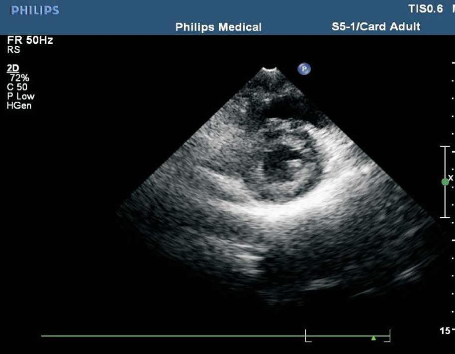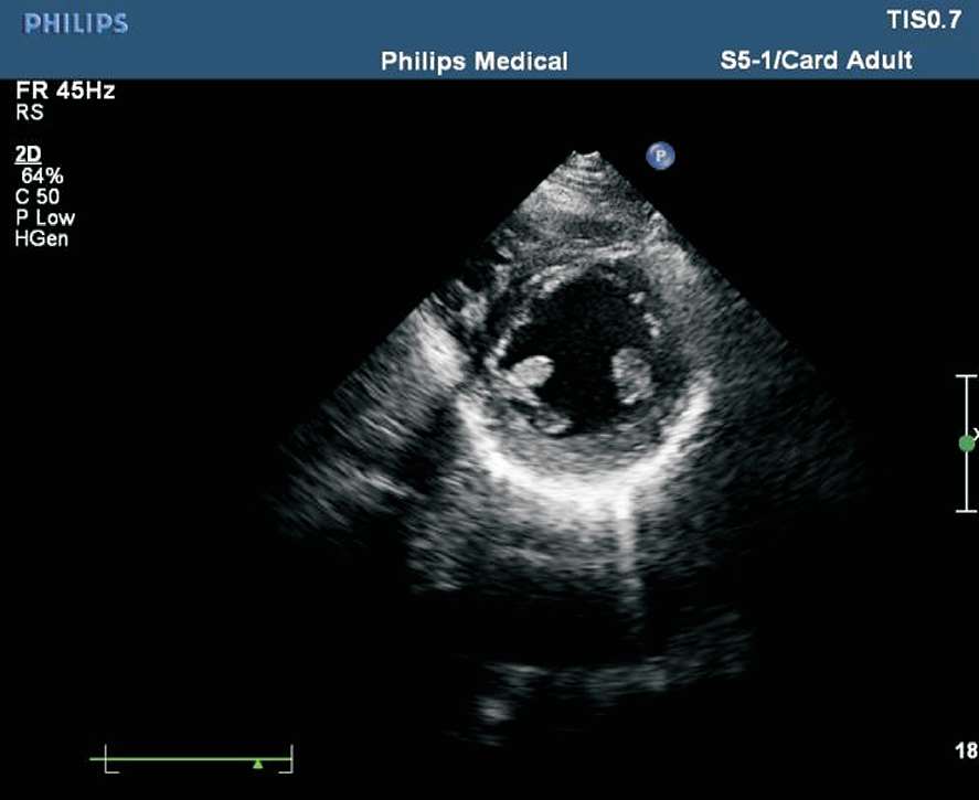 患者取左侧卧位或平卧位,探头置于胸骨左缘第3~4 肋间,声束垂直于胸骨旁左心室长轴切面,在乳头肌水平左心室短轴切面的基础上稍向心尖移动。在此切面可观察心尖部心腔及心肌,判断心尖有无血栓、室壁瘤、心尖型肥厚型心肌病、心肌致密化不全等(见图1-31)。