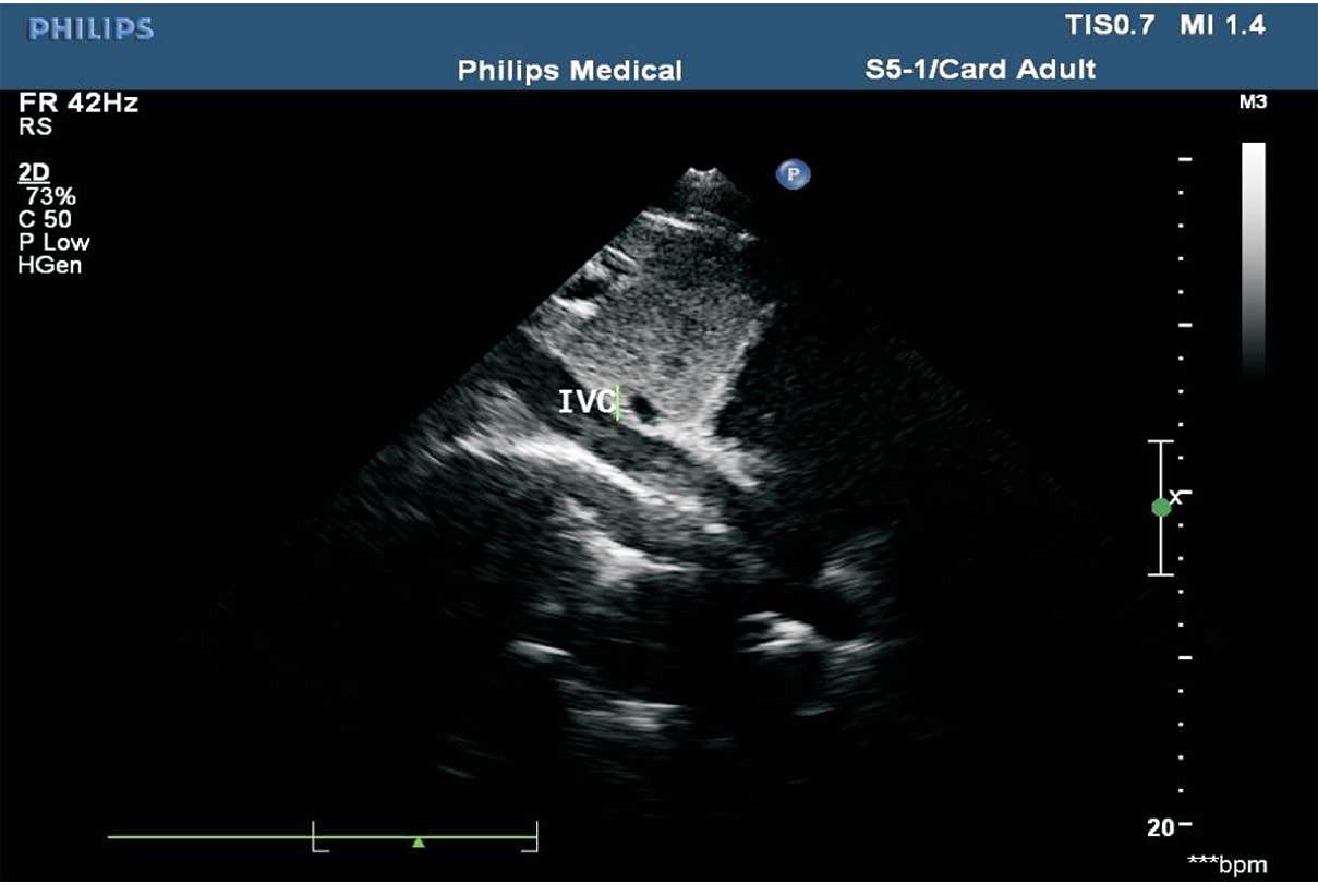 (3)下腔静脉的内径及塌陷率。在距右心房入口2 cm处测量下腔静脉内径。下腔静脉塌陷率=(下腔静脉最大内径-下腔静脉最小内径)/下腔静脉最大内径×100%。正常状态下,下腔静脉内径小于21 mm,塌陷率大于50%(见图1-43)。