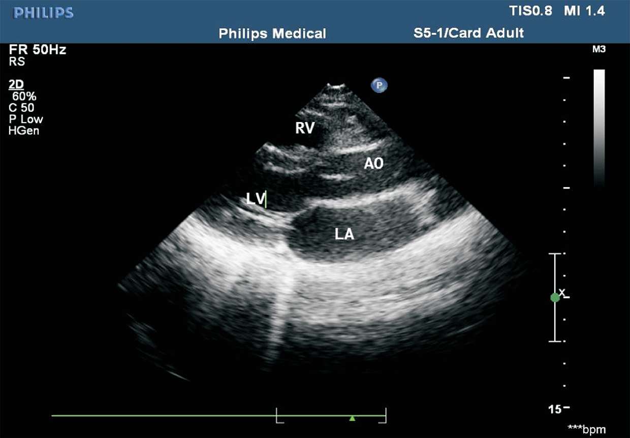 图1-26 胸骨旁左心室长轴切面(RV:右心室;LV:左心室;AO:主动脉;LA:左心房)