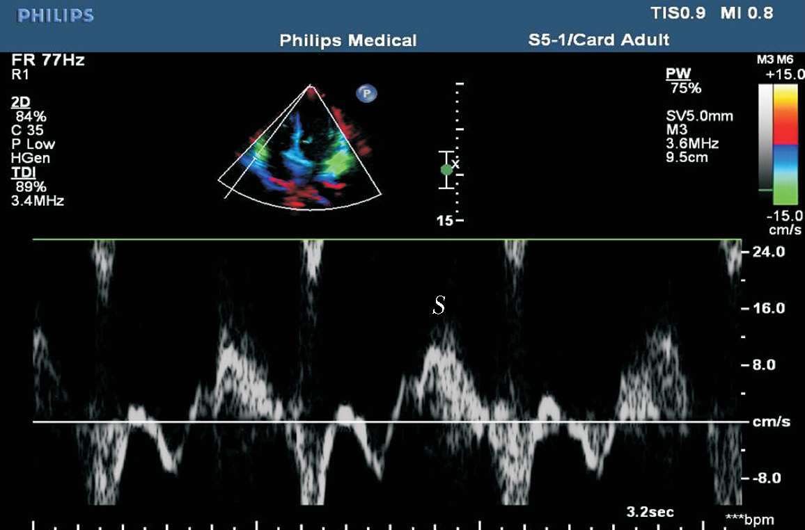 (5)组织多普勒,常以二尖瓣环组织多普勒数据评价左心室收缩功能。二尖瓣环组织多普勒频谱由收缩期正向Sa波、舒张期负向Ea(E′)波和Aa(A′)波组成。Sa波正常值应在5~6 cm/s以上(见图1-37)。