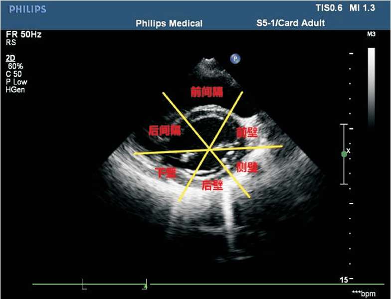 (7)常用的室壁分段方法为16段法。左心室长轴切面将左心室分为3等分:基底段、中间段及心尖段。基底段、中间段短轴切面分为6 等分:左心室前壁、左心室侧壁、左心室后壁、左心室下壁、后间隔及前间隔(见图1-38)。心尖段短轴切面分为4等分:左心室前壁、左心室侧壁、左心室下壁及室间隔(见图1-39)。