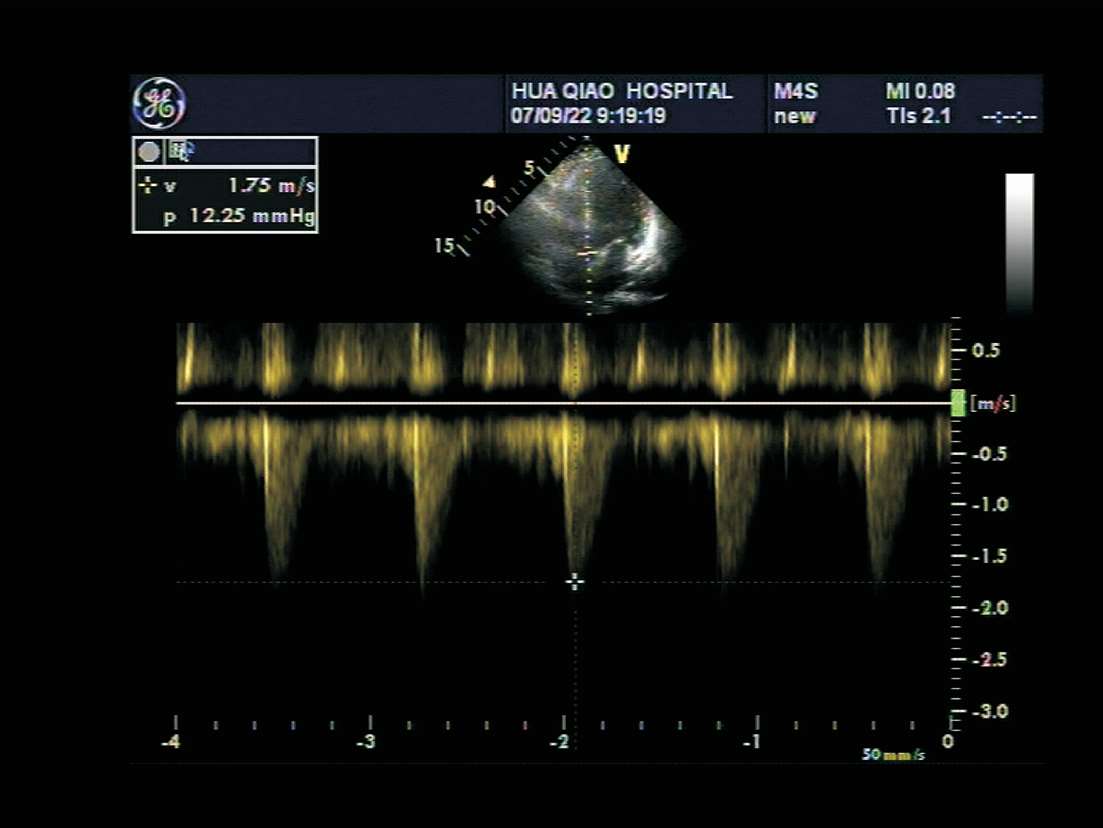 (4)连续多普勒技术测量左心室dp /dt ,适用于二尖瓣有反流,且反流速度大于3.0 m/s者。于心尖四腔心切面得到二尖瓣反流频谱,准确测量频谱上1 m/s、3 m/s之间的时间间期(T)。公式: dp / dt =32 mmHg/T,正常情况下 dp / dt ≥1200 mmHg/s。