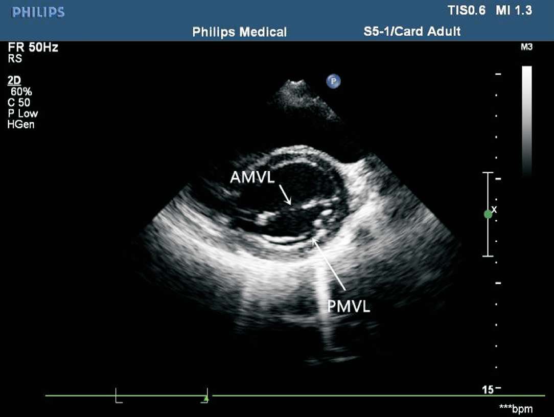 图1-29 二尖瓣水平左心室短轴切面(AMVL:二尖瓣前叶;PMVL:二尖瓣后叶)