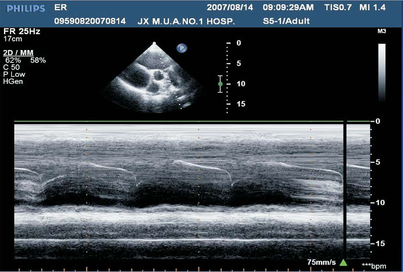 (1)胸骨旁左室长轴切面M型取样线置于二尖瓣瓣尖水平。