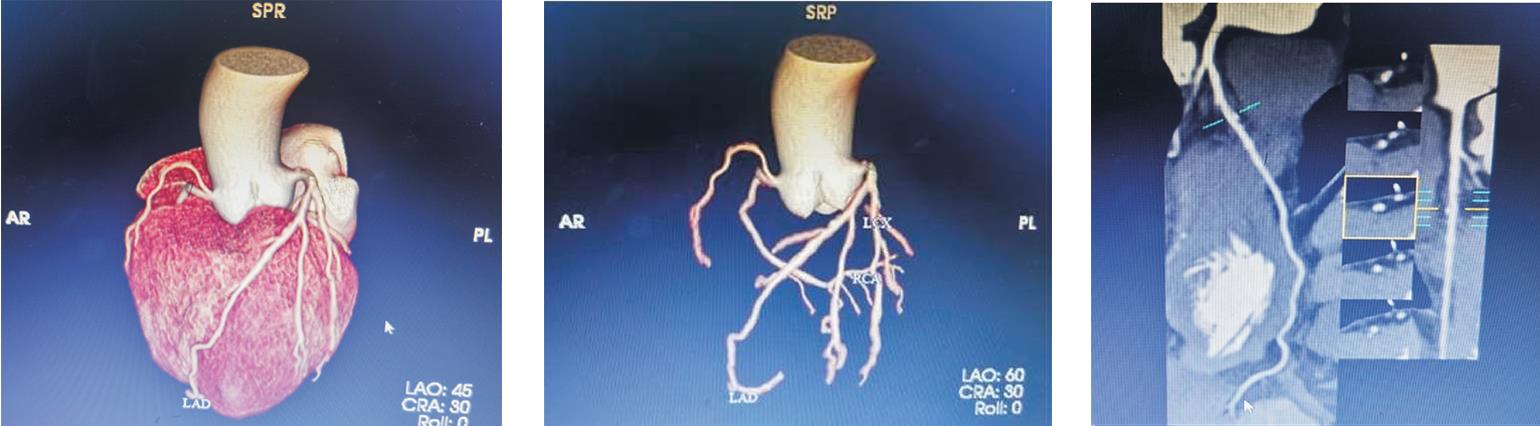 冠脉CTA检查属于一种非侵入性血管造影方法,不需要恢复时间。先对胸部进行正定位像扫描,通过门控心电测定,设置扫描范围、时间及参数等;予以对比剂注射,用高压注射器通过肘部静脉将对比剂注入患者体内;获取横断面图像后重建三维立体成像。冠脉CTA检查与冠状动脉造影检查相比具有无创、恢复快等优点,两者均可以评价患者的冠状动脉血管情况,但冠脉CTA检查对于测量冠状动脉钙化斑块负荷、了解冠状动脉管壁及冠状动脉外情况有一定优势。