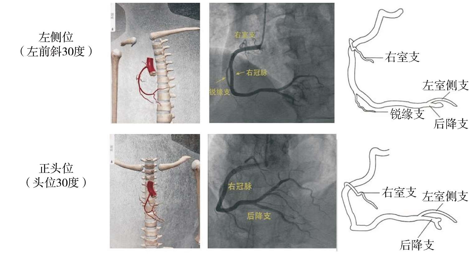 图1-47 右冠状动脉检查常用体位及X线下投影、走行