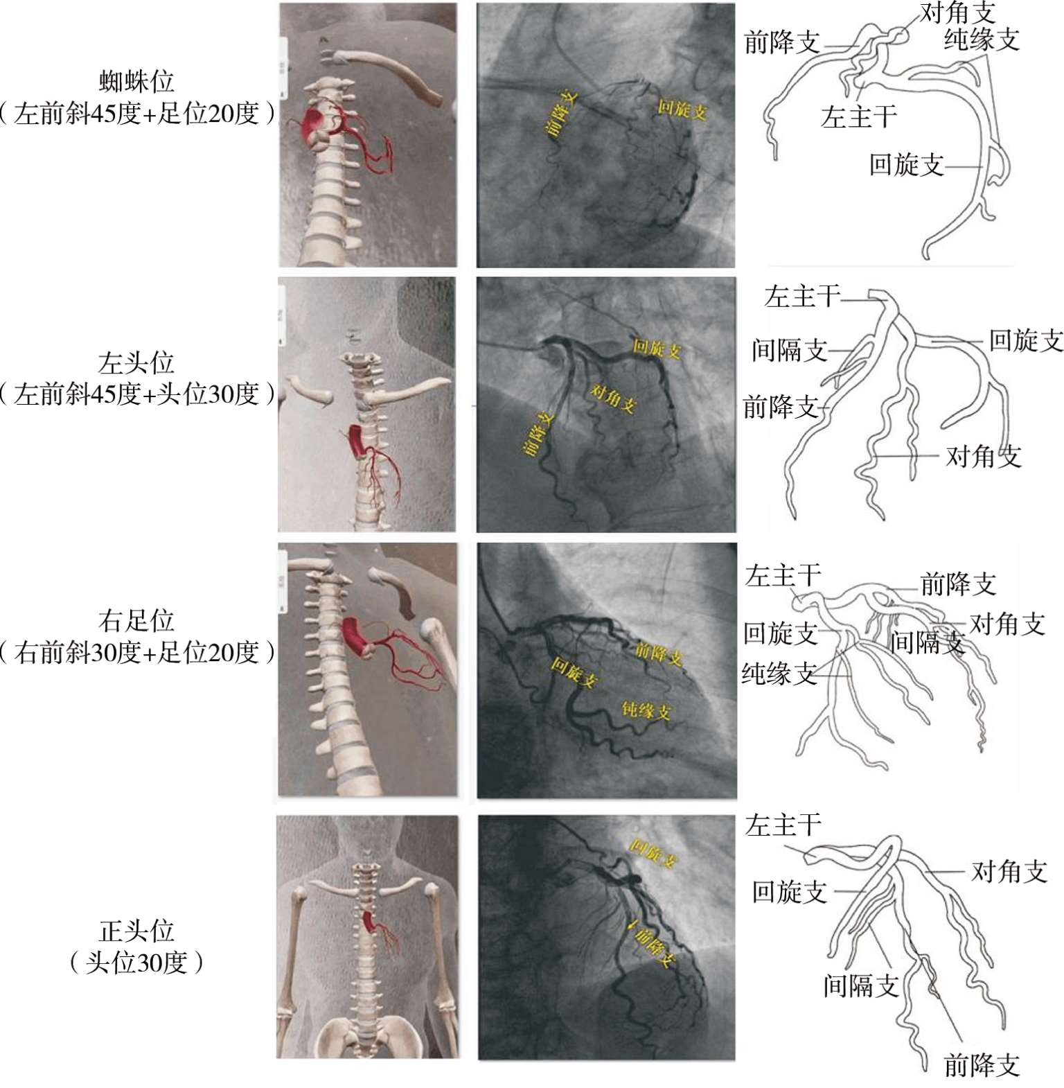 为了全面展现患者冠状动脉血管的情况,在冠状动脉造影检查过程中需要造影操作者通过踏板来控制射线,实现透视或者录像的功能。造影操作者通过检查床旁的摇杆控制C臂旋转,改变X线放射源及接收器(增强器)相对患者的位置,最后显示器上显示的造影图像会随着投照体位和角度而改变。左冠状动脉检查常用的体位有蜘蛛位、左头位、右足位和正头位(见图1-46),右冠状动脉检查常用的体位有左侧位和正头位(见图1-47)。